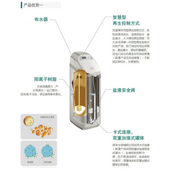 专利的逆流再生系统,再生时比同类产品省33%再生剂,省65%的水。